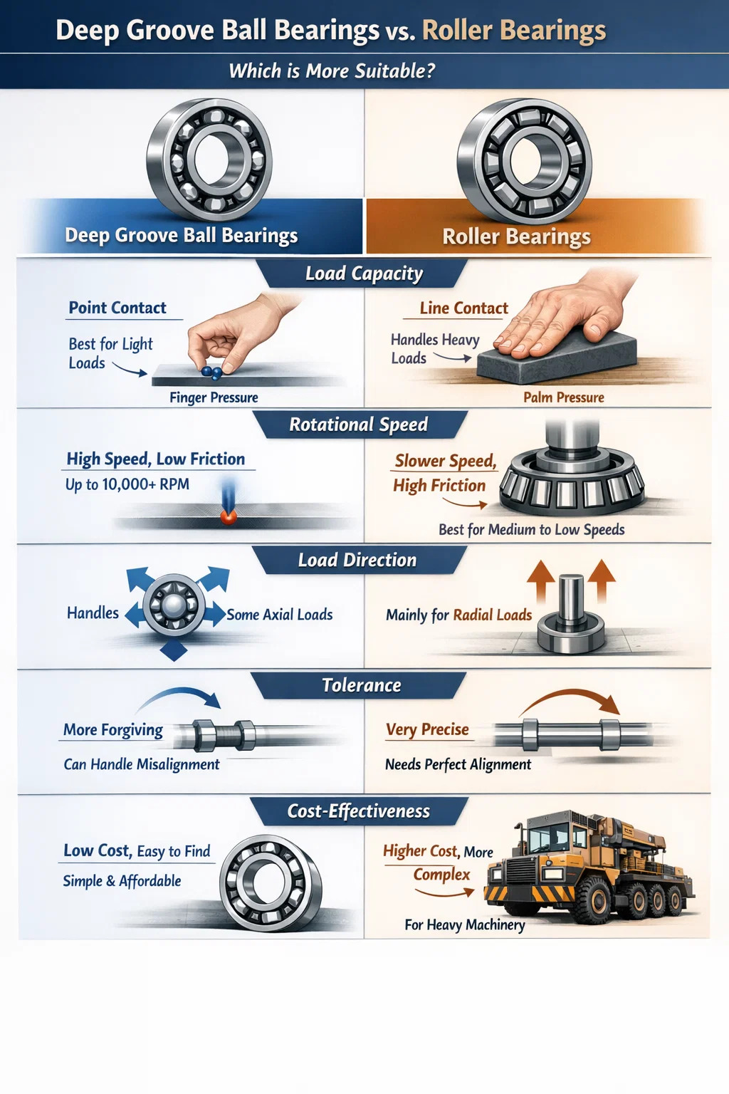 Rodamientos rígidos de bolas: Son bastante "indulgentes". Si el eje está ligeramente desalineado, aún pueden girar sin fallar inmediatamente. Rodamientos de rodillos: Muy "quisquillosos". Debido a que tienen contacto lineal, requieren una alineación extremadamente precisa durante la instalación. Si el eje está desalineado, la fuerza se concentrará en una esquina del rodillo, lo que provocará daños rápidos.