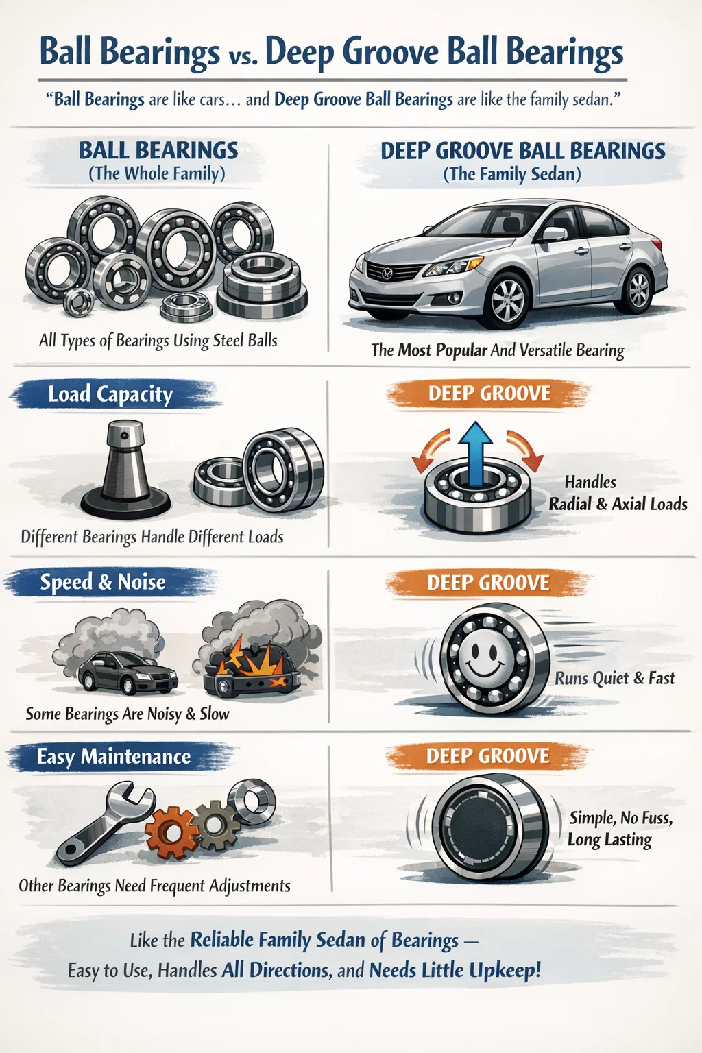 Puede pensar en los rodamientos de bolas como "automóviles" y rodamientos rígidos de bolas como el "sedán familiar" más común.